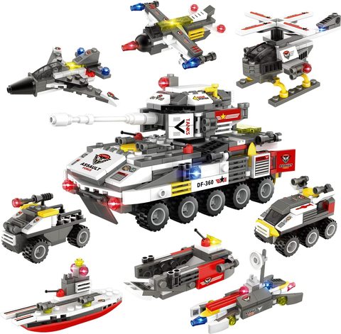 Набор строительных блоков Flytec City War Tank 8 в 1 для детей, с армейскими транспортными средствами, вертолетом, самолетом, лодкой, креативная Военная игрушка
